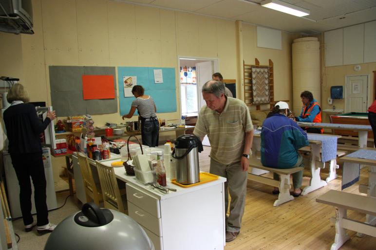 Houkuttelevat tuoksut tulivat myös keittiön puolelta, jossa Kati ja Marja-Leena keittivät herkullista lohikeittoa ja purjokeittoa. Osui tuo soppalauantai hyvin niin myös ahkerat rakentajat pääsivät syömään muiden kyläläisten kanssa ja kuulumisia vaihdettiin.