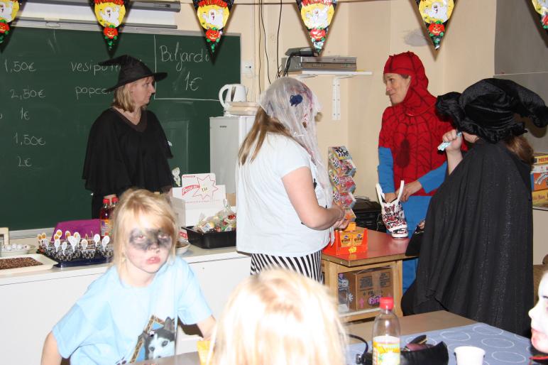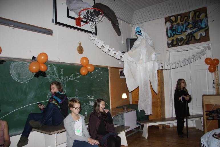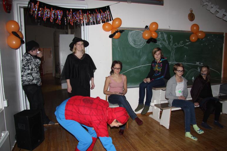Perjantai-iltana 25.10 alkoi koululle saapua hirvittäviä Halloween discoilijoita. Oli noitaa, haamua, draculaa, kissaa, prinsessaa ym...Hui kauhistus. Disco luokassa roikkui hämähäkkejä, haamuja, luurankoja IIIIIKKK.... Puffetissa oli Noita-neiti Minna ja Hämähäkkimies piti huolen turvallisuudesta. Menoa ja meininkiä. Oli myös paperilla tanssi kilpailu, paperi pieneni ja pieneni ja lopuksi oli melkein postimerkin kokoinen palanen, jonka päällä piti seistä yhdellä jalalla ja pyllyä keikuttaa, kyllä olivat taitavia. Tanssin voitti viimevuotinen paperilla tanssin mestari Halina, taito hyppysissä vai olisiko se jaloissa :).