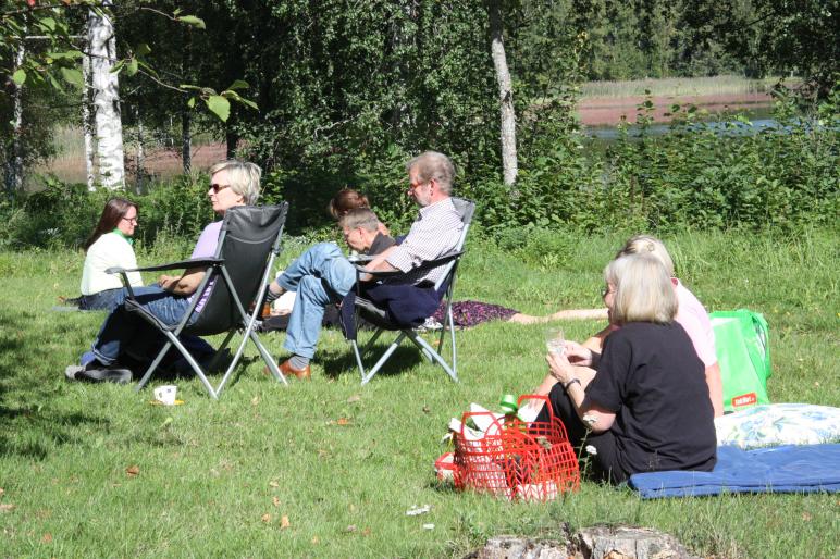 Aurinkoinen iltapäivä houkutteli kyläläisiä viettämään lauantai-iltapäivää koulun pihalla pidettävään picnic-tapahtumaan. Vilttejä leviteltiin nurmikolle ja nautittiin omista eväistä. Paikalle olimme saaneet Jussi Rämön soittamaan kauniita kappaleita ja laulukin sujui aivan ihanasti. Toivottavasti laulu ja musiikki kantautui järven yli muidenkin korviin ja he nauttivat pari tuntisesta musiikkihetkestä. Aika kului kuin siivillä jutellessa tuttujen kanssa ja nauttiessa eväitä. Tälläisiä tapahtumia kannattaisi harkita lisää.