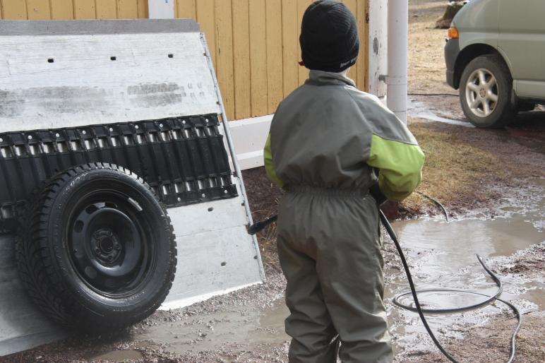 Ilmakin suosi renkaanvaihtajia ja nuorin talkoolainen 6v ( mikäli muistan oikein) Nikke Mäenpää pesi hienosti talvirenkaita kesäkuntoon.